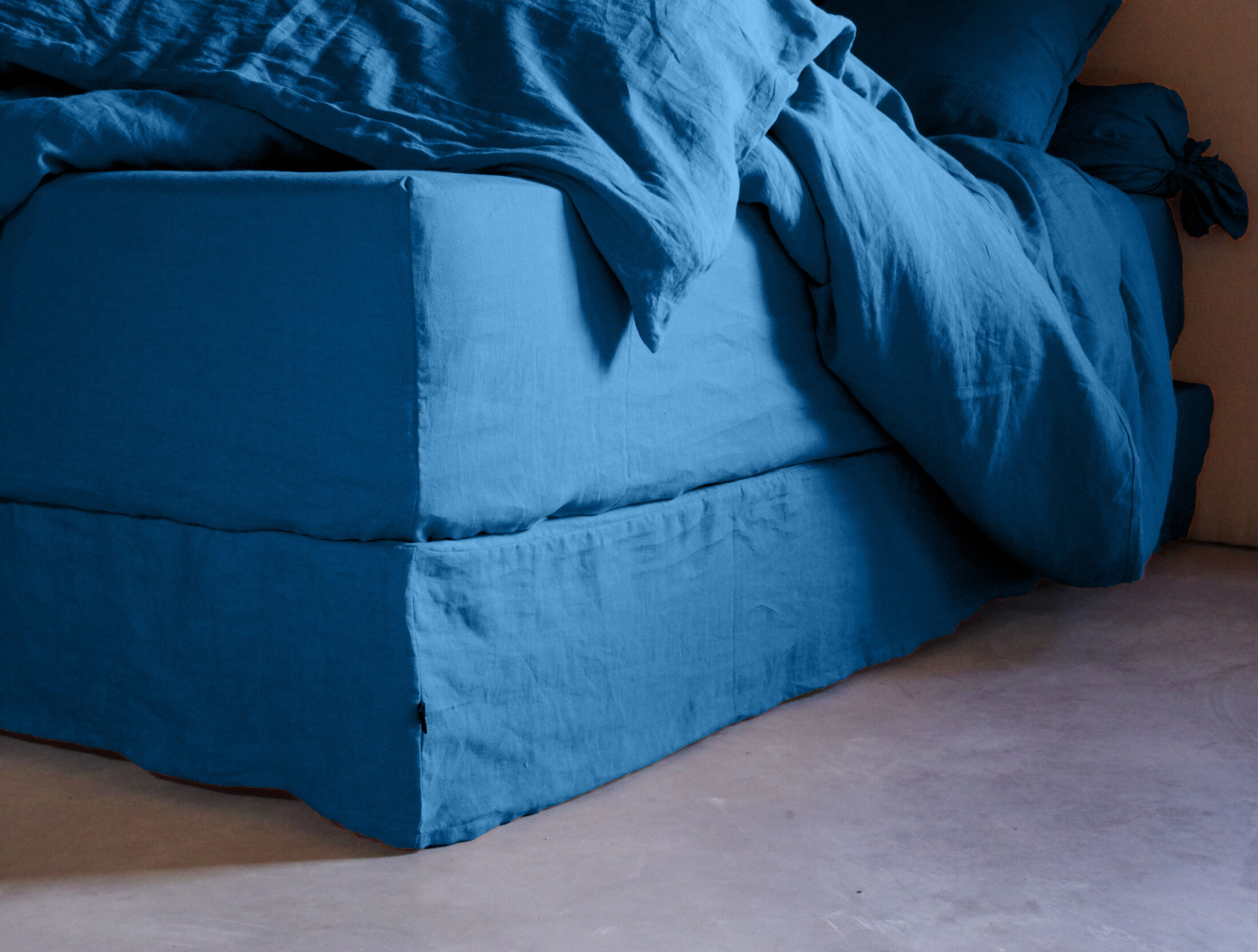Ce Cache-Sommier en Lin Lavé Bleu Prusse à angles fermés vous offre un coloris éclatant, une grande résistance et un côté écologique qui séduira les amateurs de linge de lit haut de gamme !