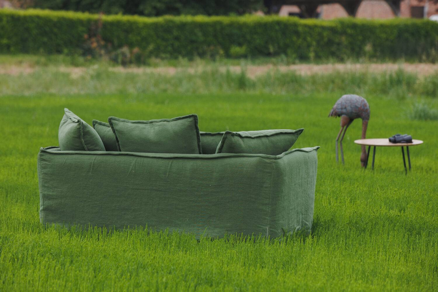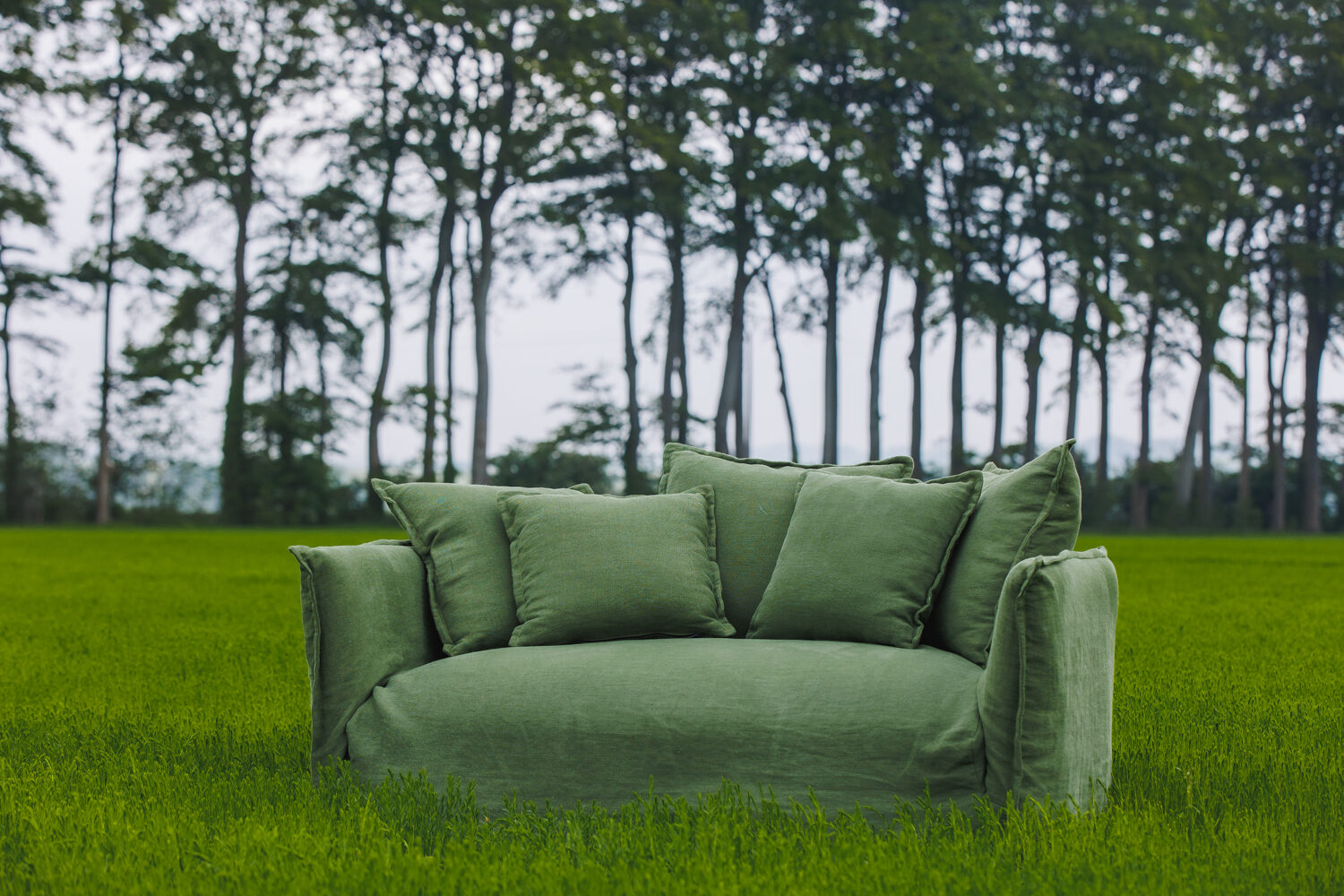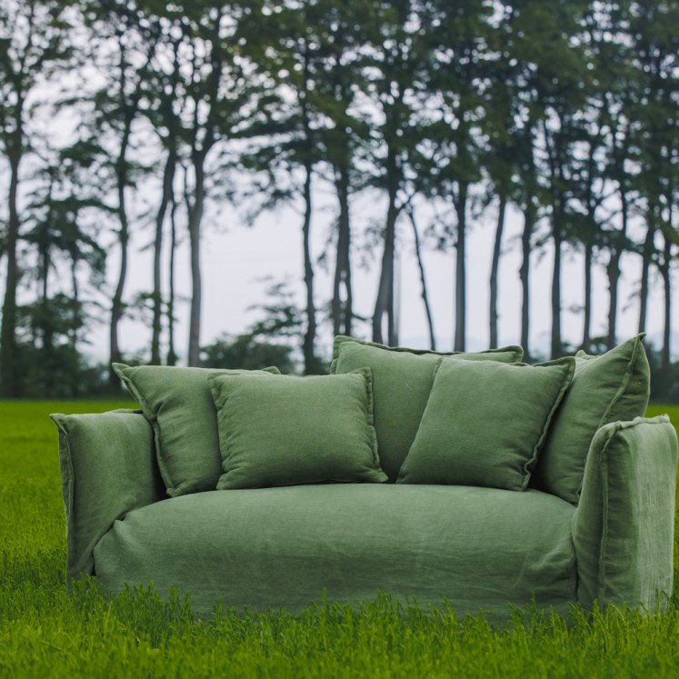 Sa housse à volant est déhoussable et 100% lin. La structure en hêtre massif est très légère et son assise est ronde et confortable grâce à la garniture de plumes.