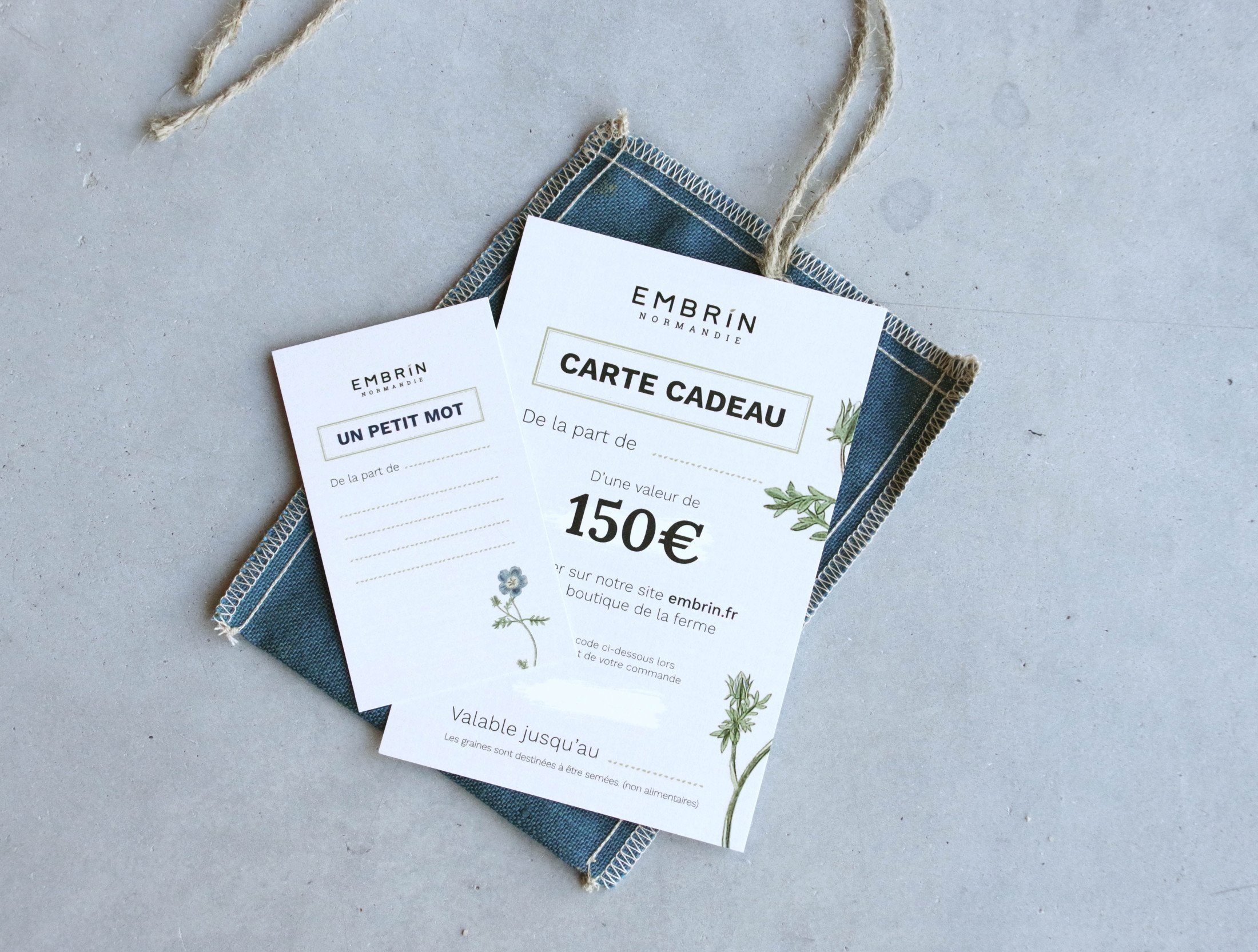 Faites plaisir à vos proches en leur offrant une carte cadeau Embrin. Ils pourront s'offrir les produits de leur choix dans nos collections de linge de lit, de table, de serviettes de bain ou d'accessoires de décoration. C'est un cadeau raffiné, écologique et durable que vous leur permettrez d'acquérir.