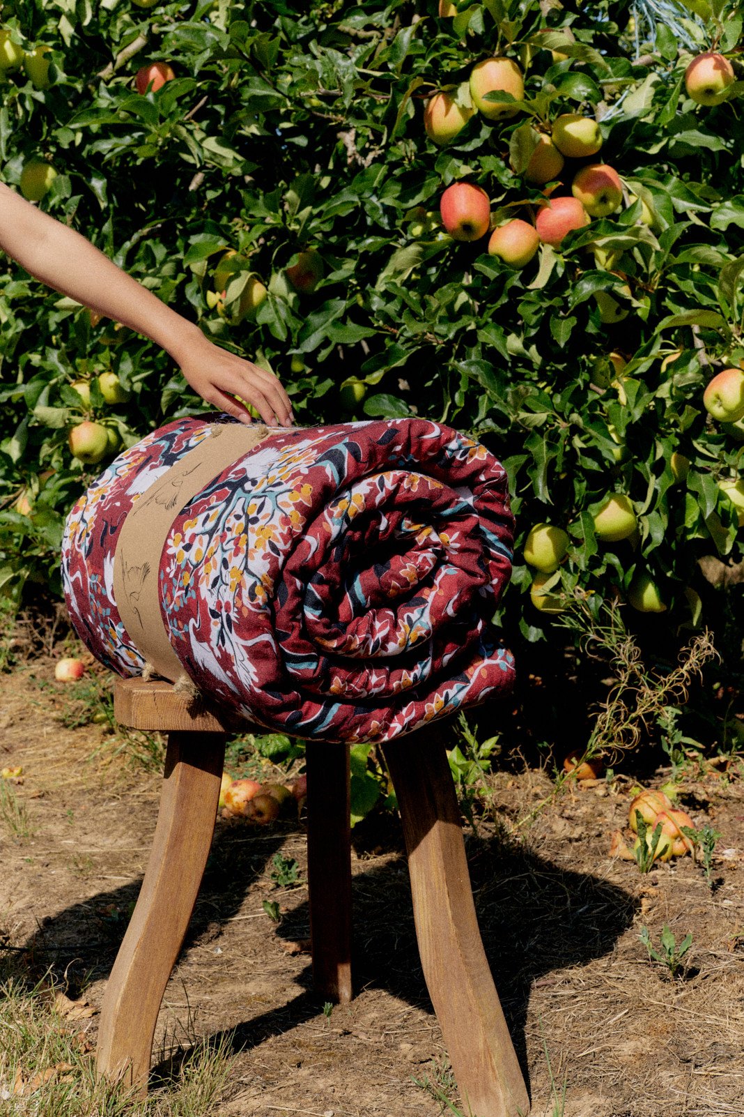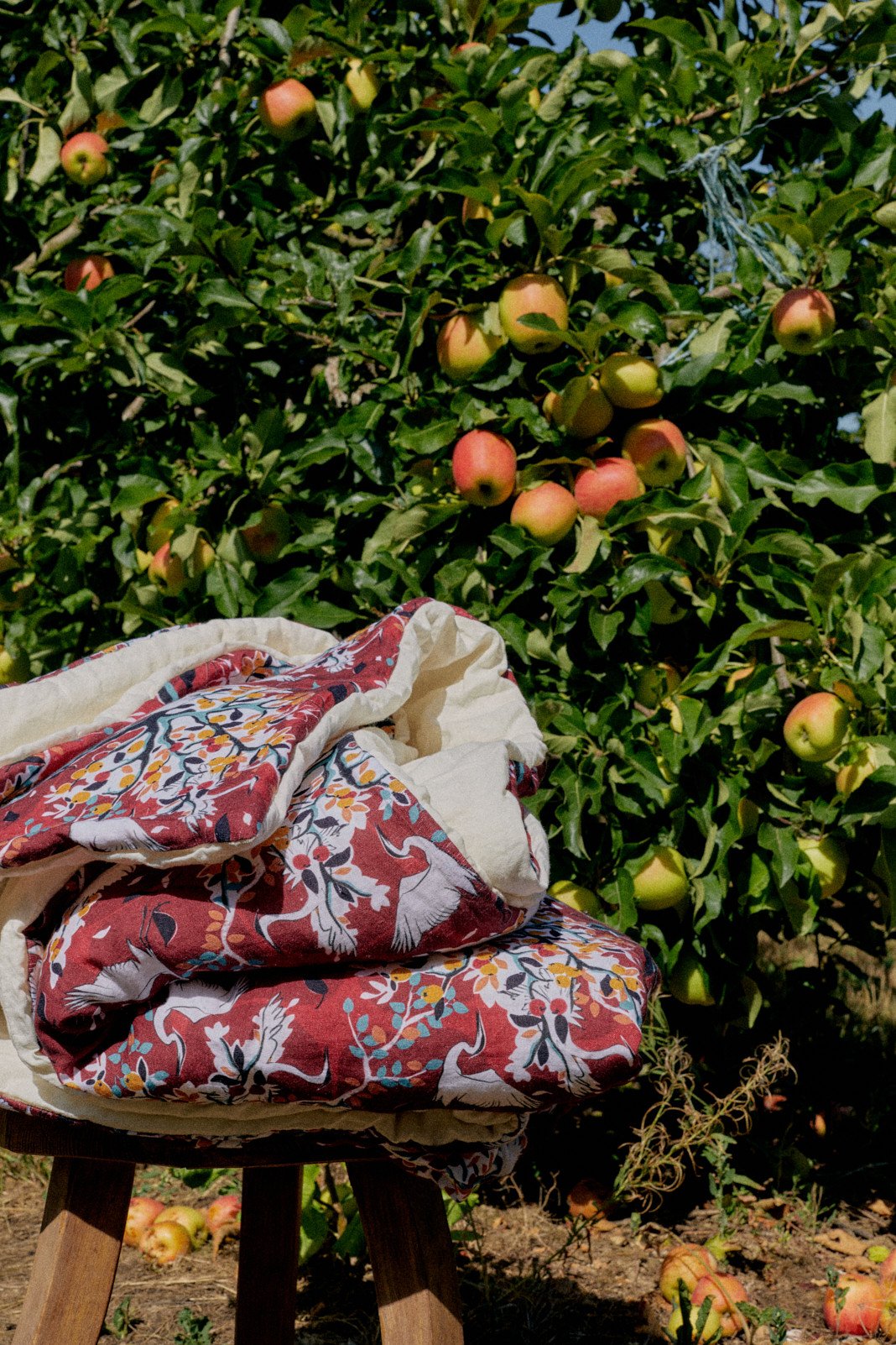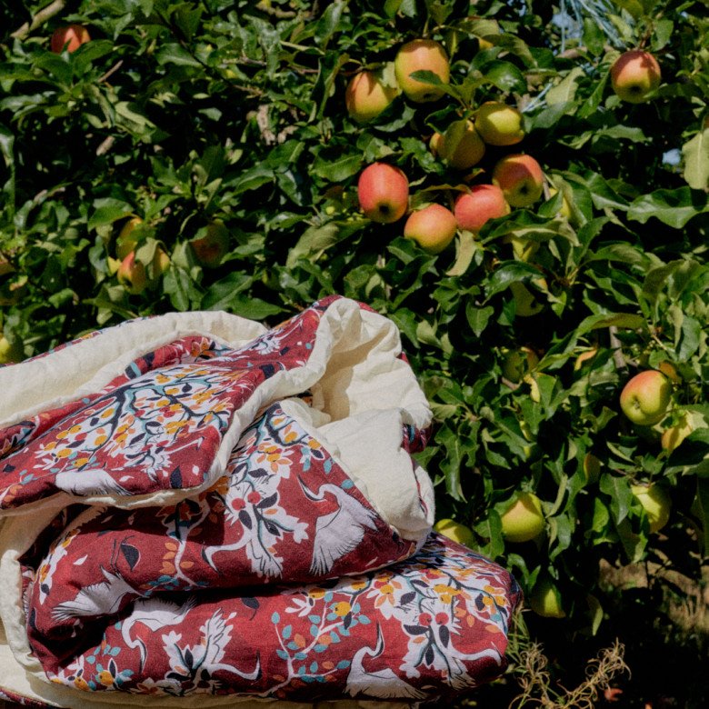 Celui-ci prend son envol au cœur de nos pommiers normands, en plein été indien. Le fond de ce dessus de lit, couleur rouge bordeaux intense, évoque la douceur du soir. Notre courtepointe en lin À l’Ombre des Pommiers recouvre votre lit pour vous réchauffer, comme une couverture supplémentaire.