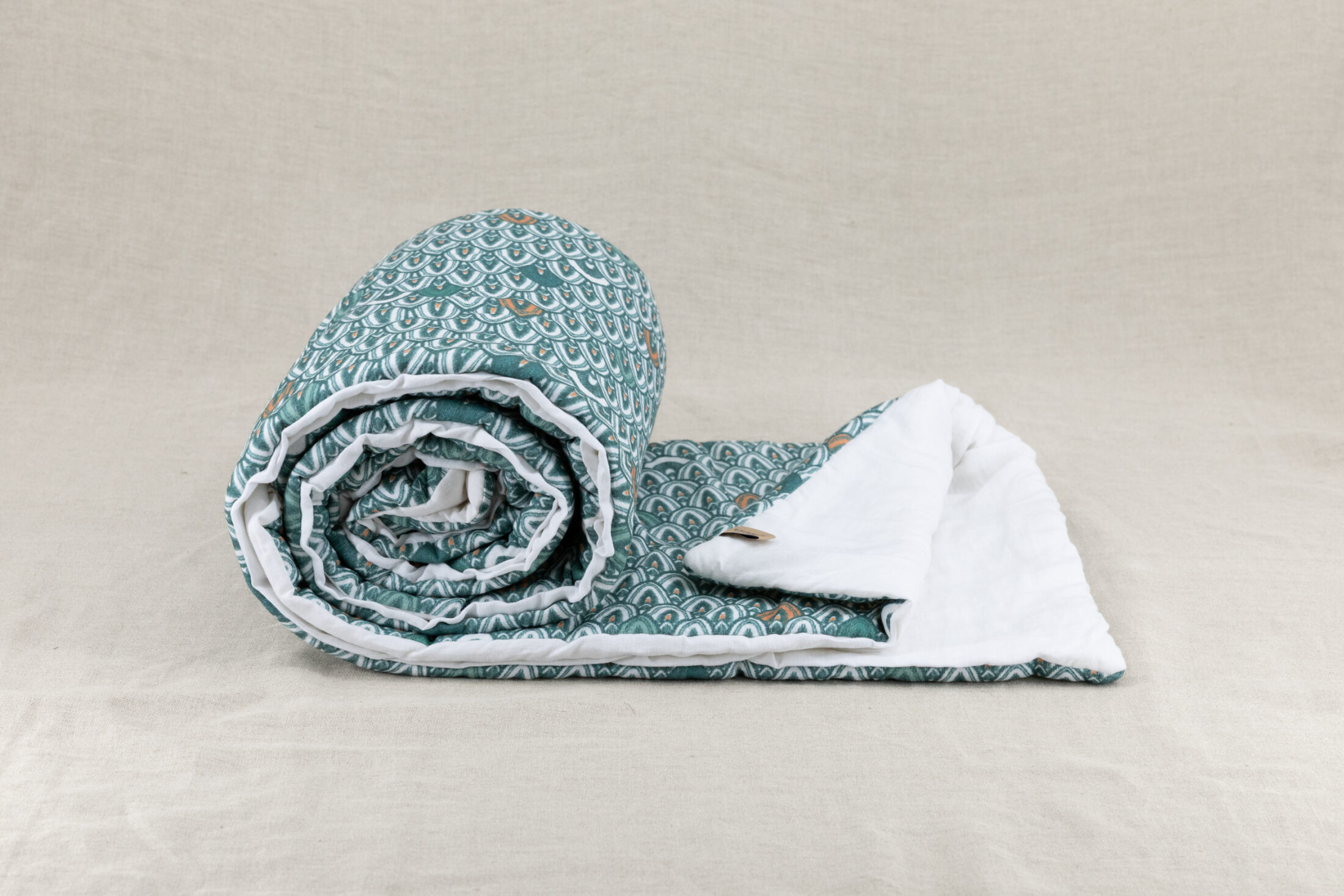 La courtepointe Envol de faisans ravira votre intérieur avec ses multiples combinaisons possibles pour parfaire votre décoration. Elle s’associera parfaitement avec une housse de couette couleur craie ou caramel ou encore une parure de draps couleur colvert pour encore plus de singularité.
