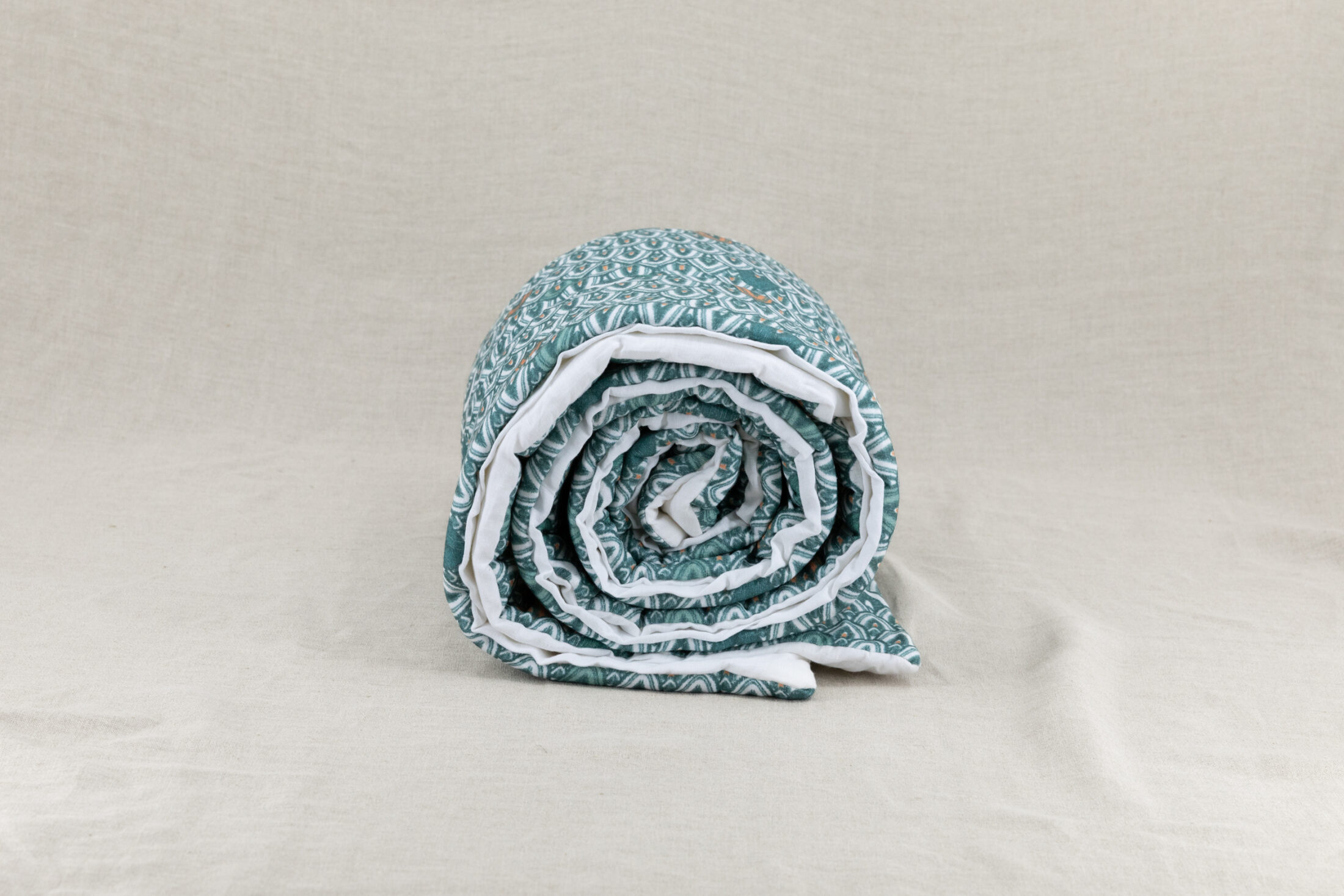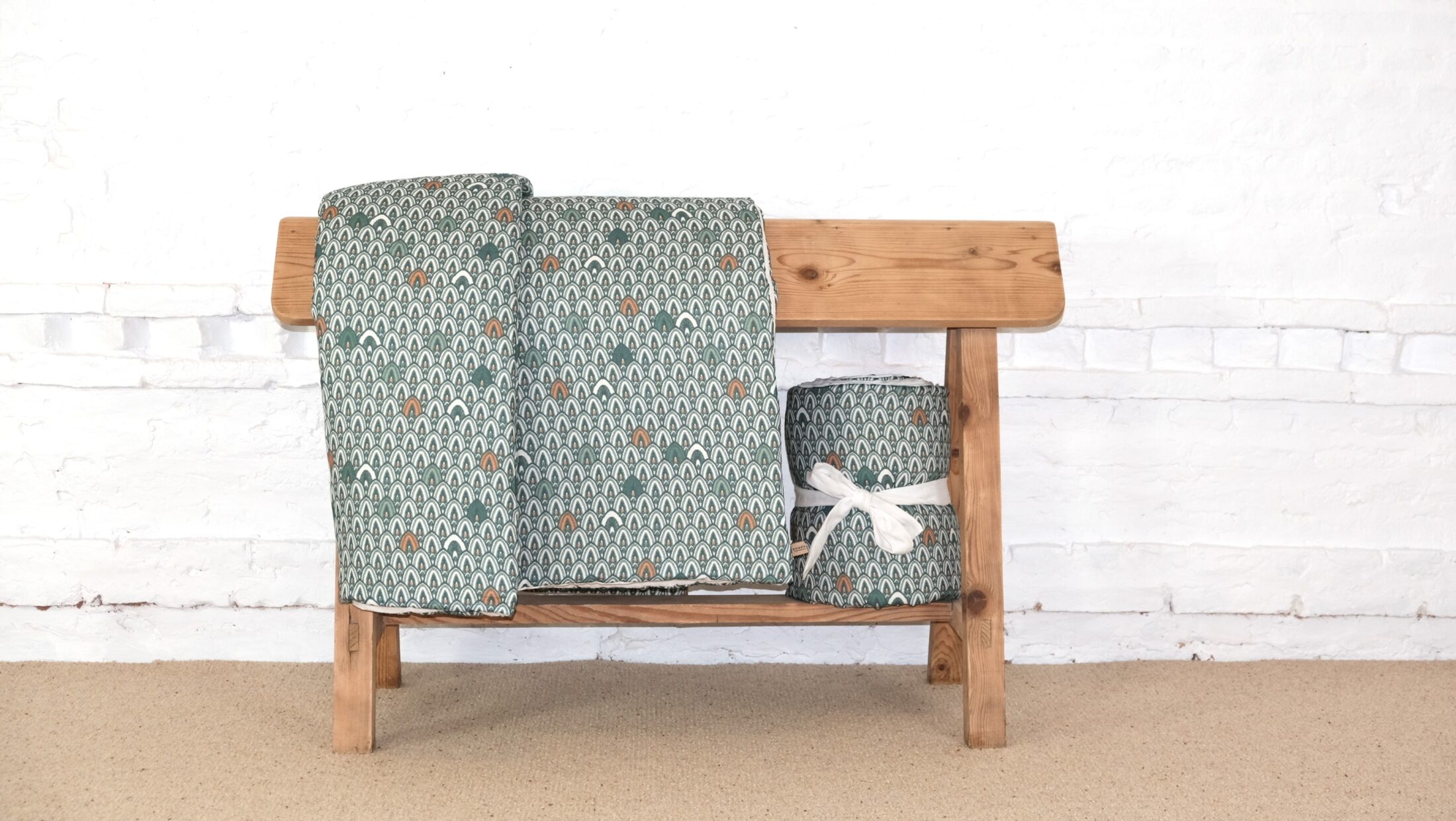 Déployée, cette courtepointe aux motifs « Envol de faisans » apparaît encore plus belle, nous laissant admirer l’équilibre de ses plumes. Son allure à la fois noble et contemporaine dévoile une douce composition qui invite à se plonger dans une atmosphère emplie de quiétude et de douceur.