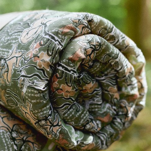Plongée dans les plaines et les bois normands avec notre Courtepointe en Lin Lavé Motif Découverte de la Faune Sauvage à dominante vert kaki.