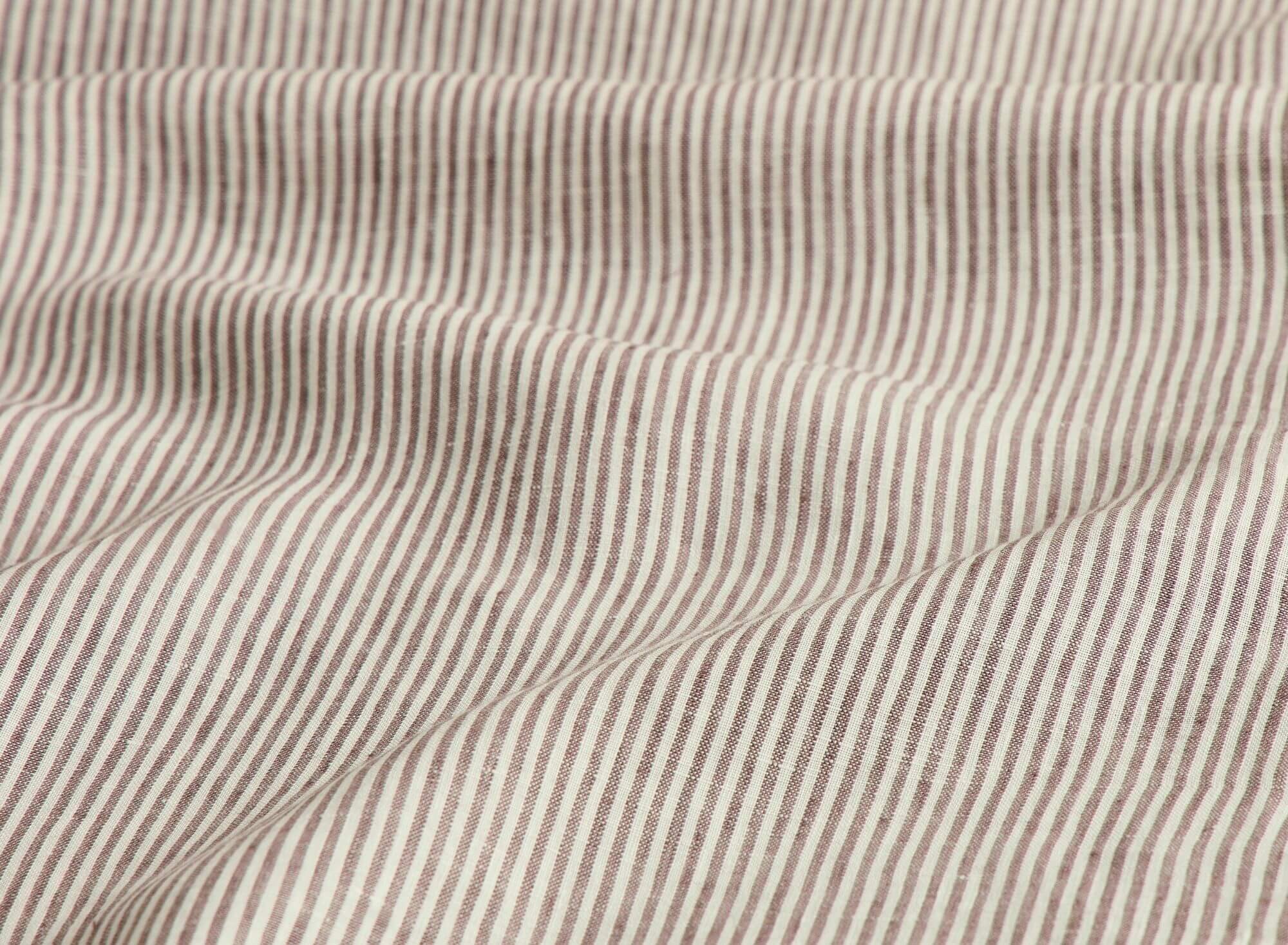 La couleur principale de ce drap est un blanc, évoquant la fraîcheur et la sobriété. De fines rayures couleur prune, régulièrement espacées de 2 mm, parcourent la longueur du tissu, ajoutant une touche subtile de sophistication et de contraste. Ces rayures apportent une note de couleur qui rehausse l'esthétique sans surcharger le design.
