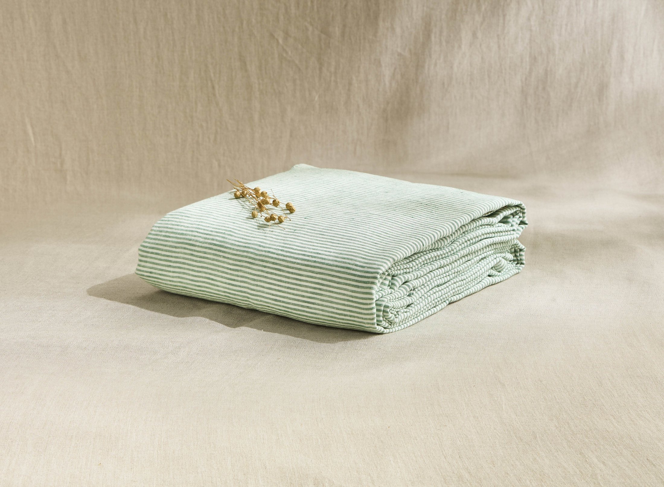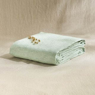 Ce drap plat en lin avec des rayures sauge est un vrai plaisir pour la peau. Très doux et élégant.