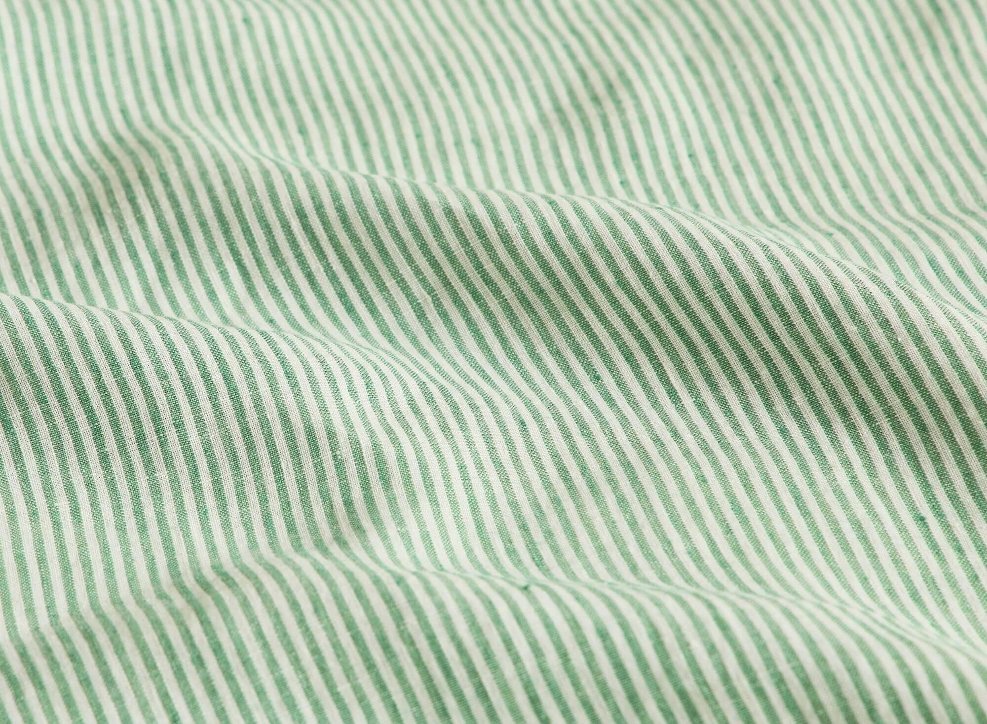Sa couleur de fond est un blanc pur et élégant, rehaussée par de fines rayures d'un vert sauge délicat, qui ajoutent une note de fraîcheur et de modernité à ce textile intemporel. Notre collection de draps en lin est idéale pour créer une ambiance apaisante et raffinée dans votre chambre, tout en bénéficiant des garanties écologiques et de sécurité offertes par la certification OEKO-TEX.