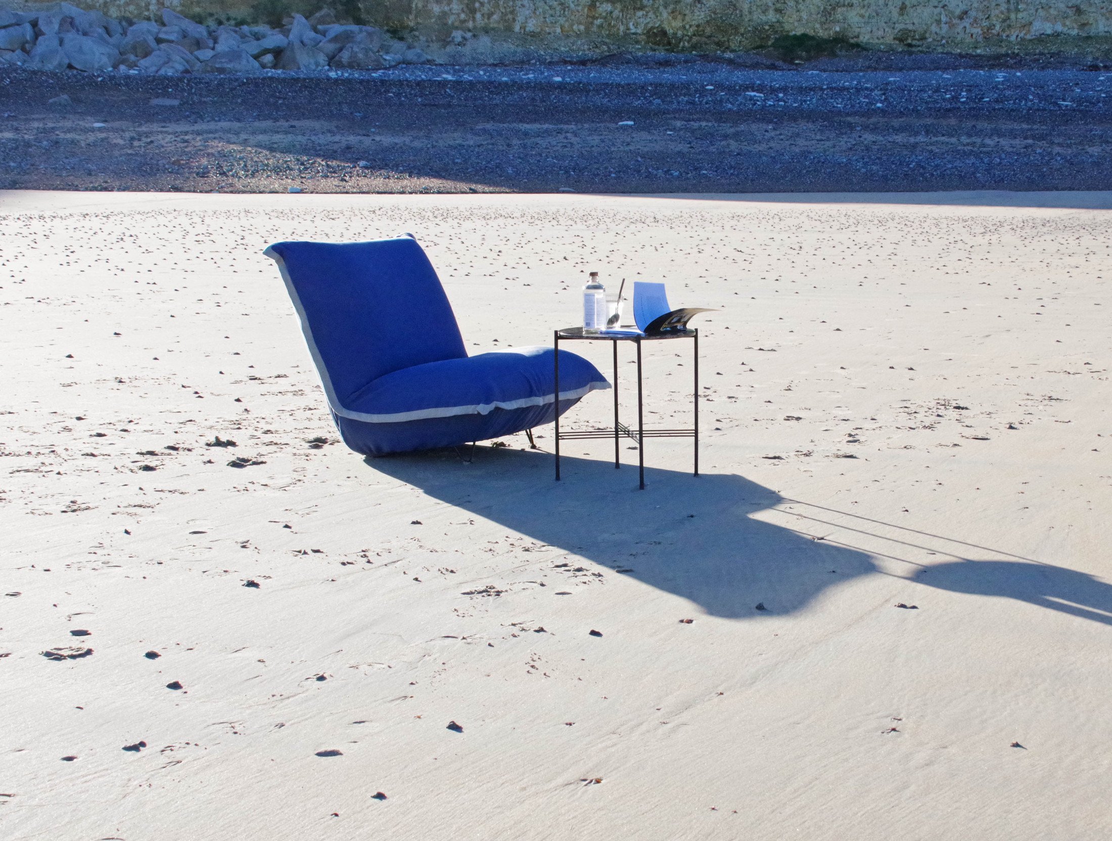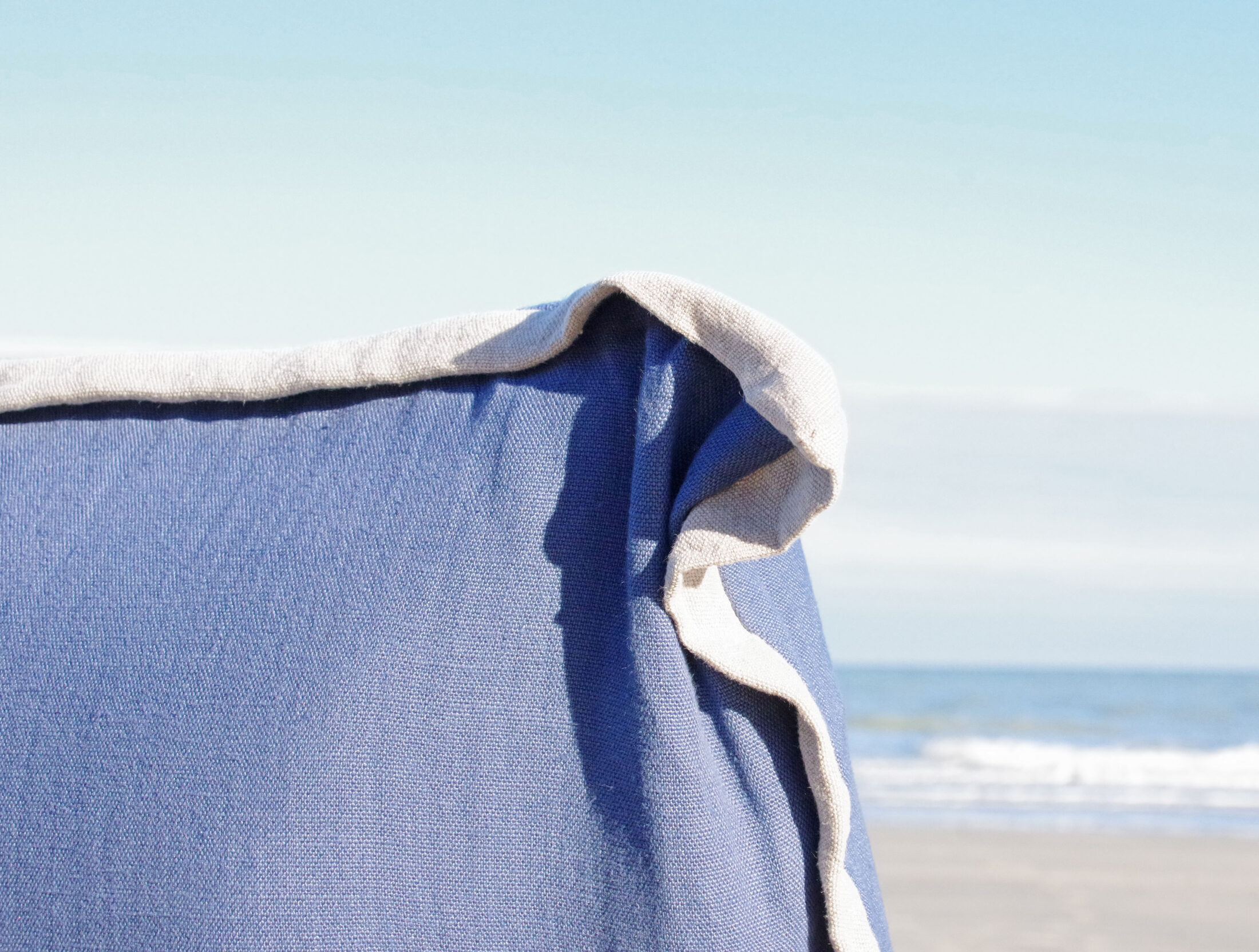L'ensemble est recouvert d'un tissu en lin 100% Normand d'un bleu océan dense avec une finition à volant lin de 4 cm naturel ainsi que des pieds en acier noir ce qui lui confère un aspect légèrement graphique.