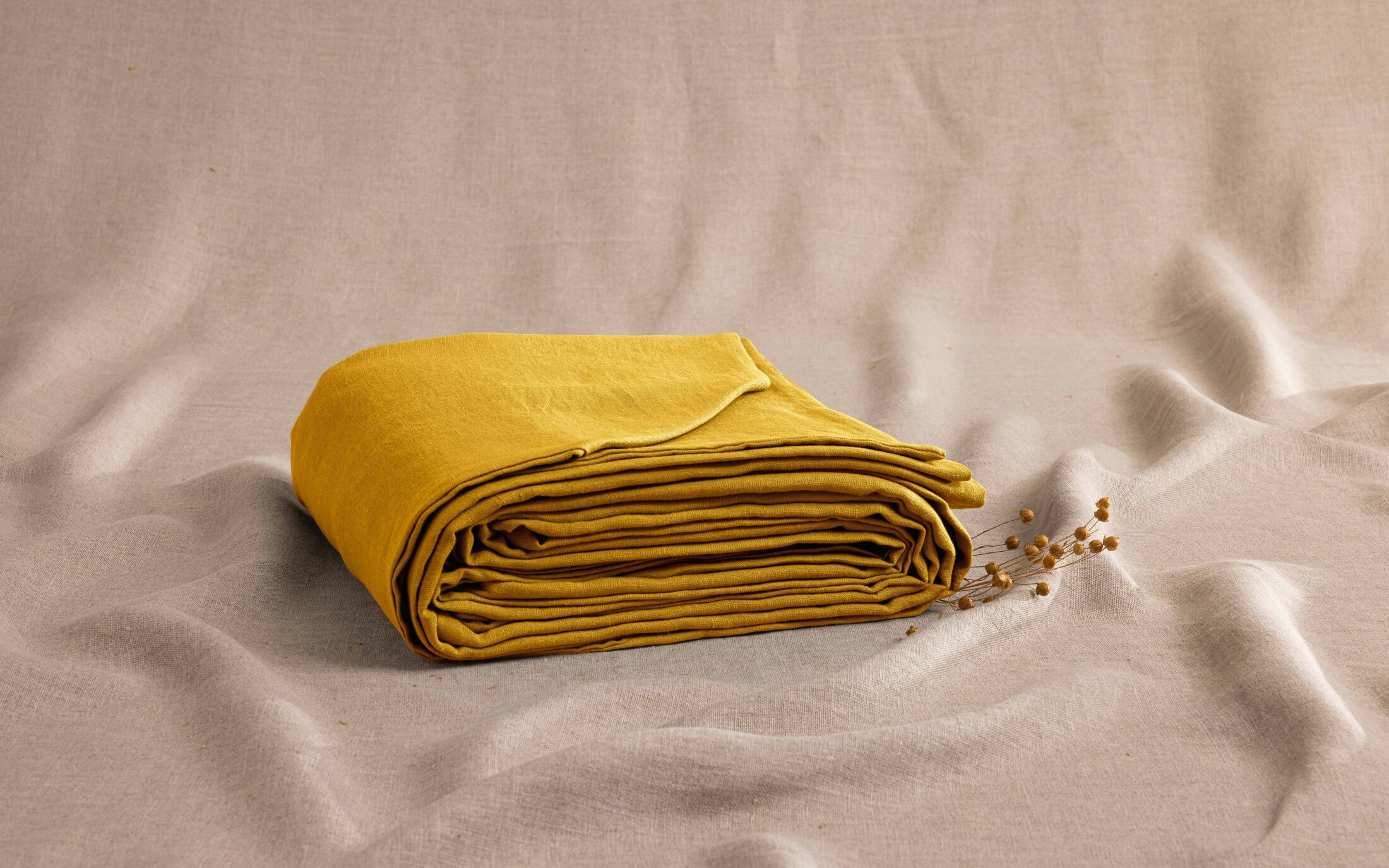Vibrante et solaire, notre housse de couette en lin lavé Safran insuffle instantanément énergie et élégance à la chambre.