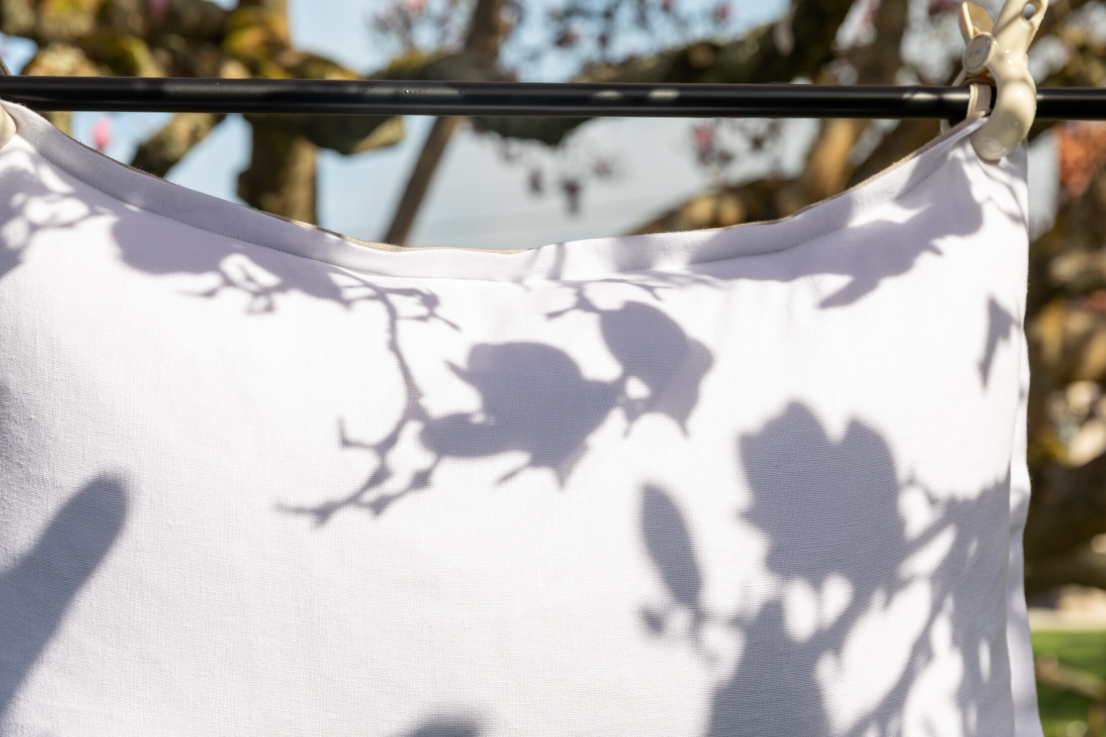 Cette housse de coussin se distingue par son design bicolore : le recto présente le Blanc Optique tandis que le verso révèle la teinte lin naturel Ficelle. L’association de ces deux nuances crée un contraste délicat qui souligne la matière et apporte une élégance discrète à l’ensemble. La finition double volant, signature de nos housses de coussin, encadre le coussin avec légèreté et apporte un relief décoratif tout en finesse.