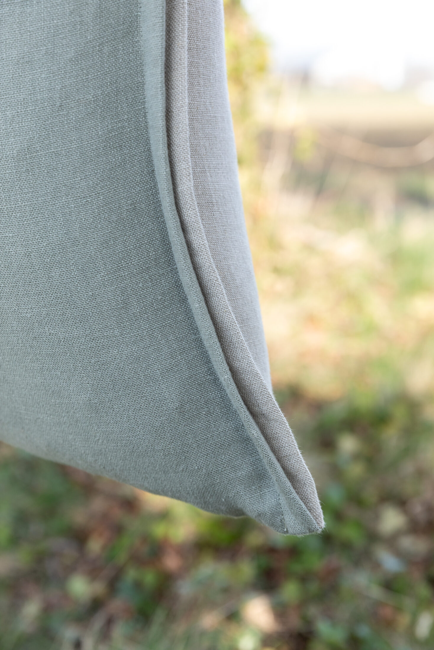 Cette housse associe deux teintes dans un design bicolore : Lichen pour le recto, lin naturel Ficelle pour le verso. Le contraste raffiné met en valeur la matière et offre une décoration modulable selon vos envies. La finition double volant, réalisée avec soin par nos couturières est la signature de nos créations. Elle souligne le coussin avec délicatesse et sophistication.
