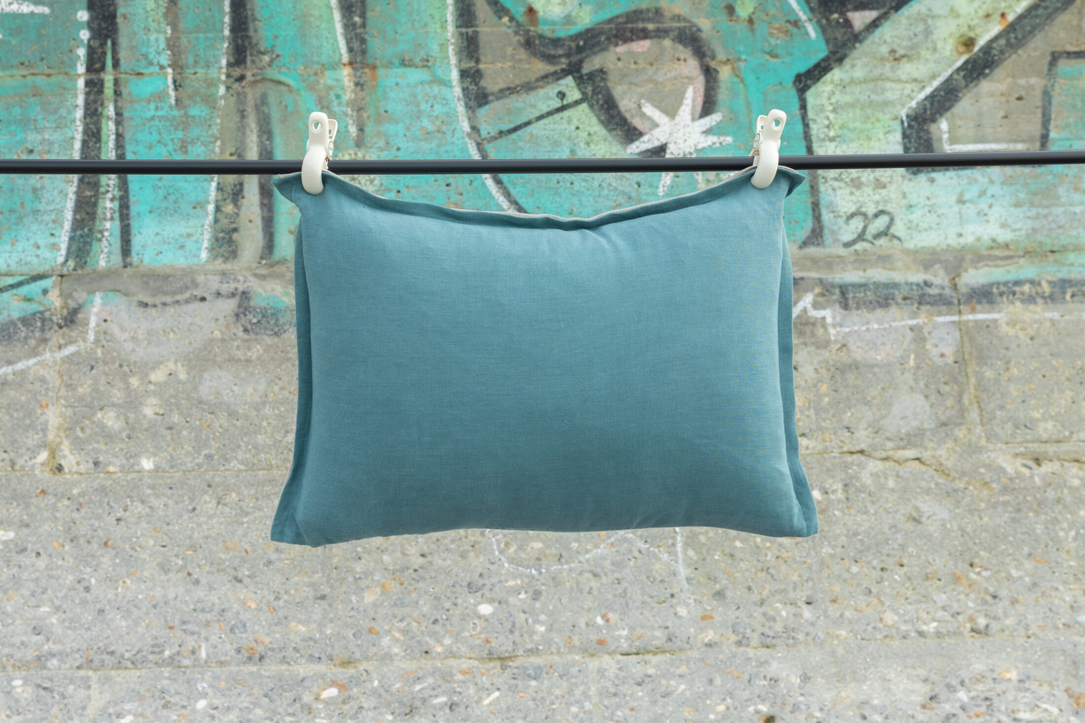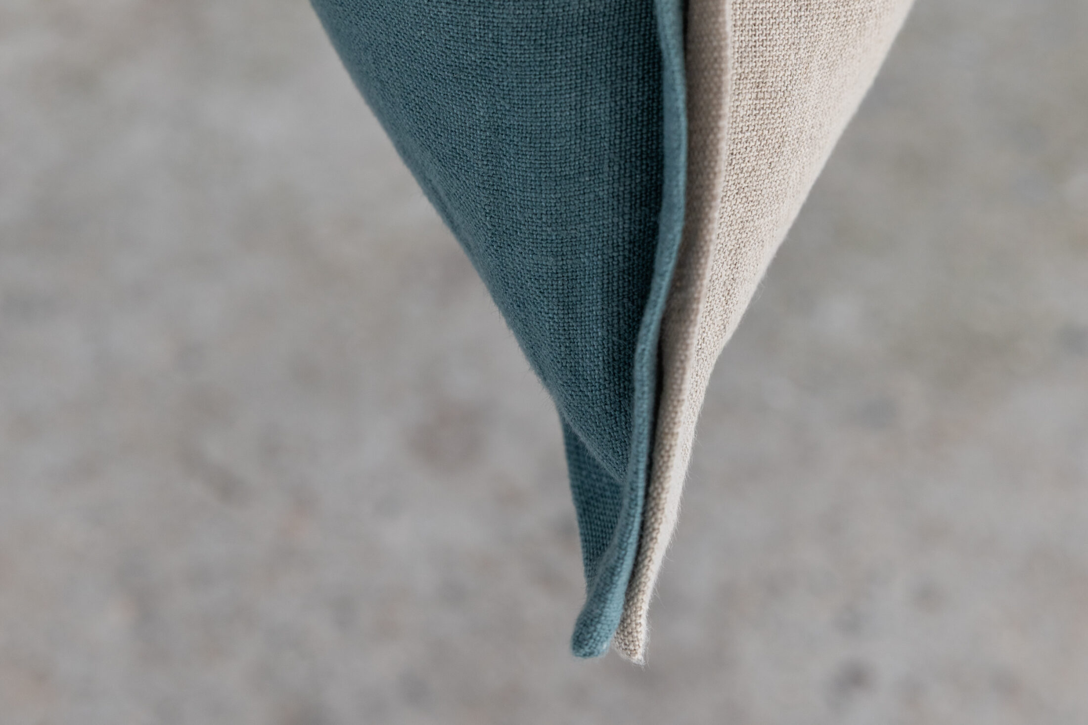 La housse de coussin en lin lavé Vert Paon révèle une nuance intense, à la frontière du bleu et du vert. Une teinte vibrante qui souligne la texture du lin et habille naturellement un canapé ou un lit.