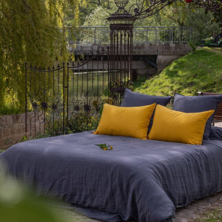 Imaginez une parure de lit en lin lavé qui marie avec élégance le gris silex et le jaune safran, créant une ambiance à la fois moderne et chaleureuse.