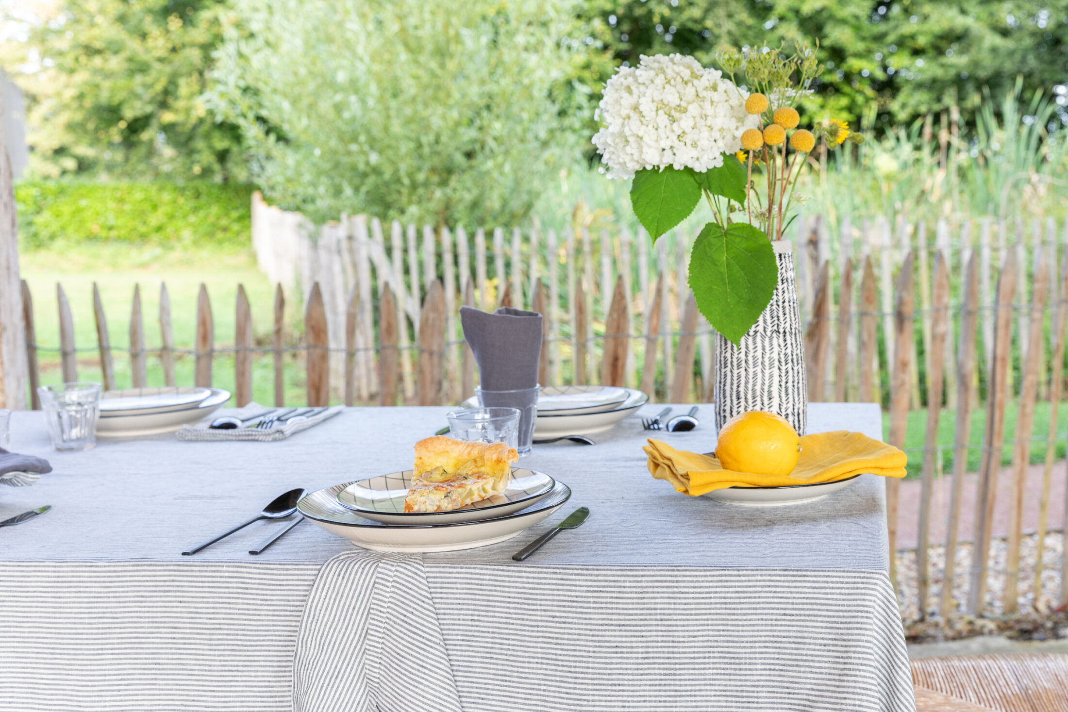 Cette nappe se prête aussi bien aux repas du quotidien qu’aux grandes occasions. Sa palette neutre permet de l’associer facilement à une vaisselle épurée, en porcelaine blanche par exemple, comme à des pièces plus colorées pour un contraste audacieux. Pour les serviettes de table, vous pouvez opter pour les mêmes rayures, le gris silex uni ou encore le blanc craie.