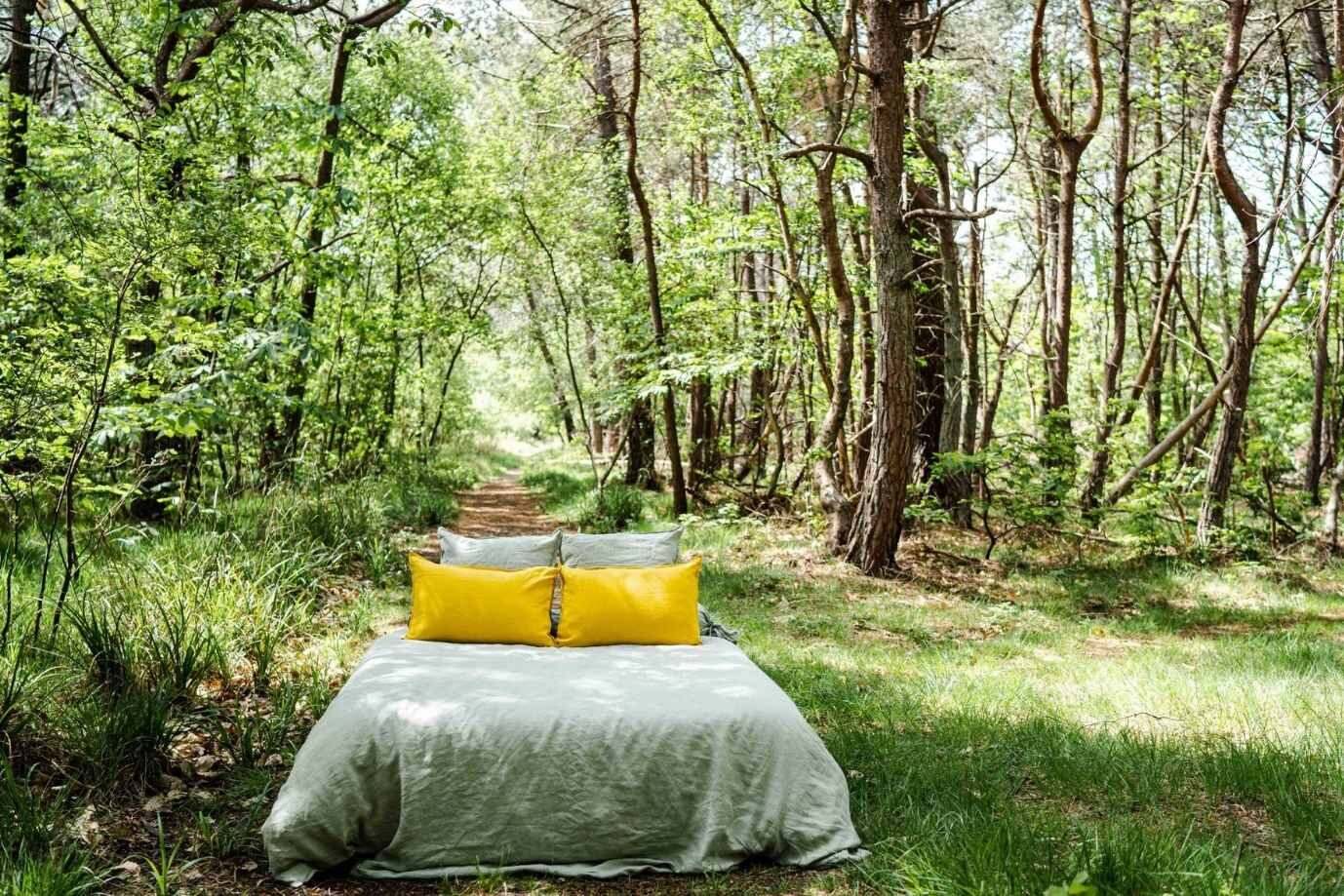 Imaginez une parure de lit en lin lavé qui combine harmonieusement les coloris vert tilleul et jaune safran, créant un espace reposant mais plein de vitalité.