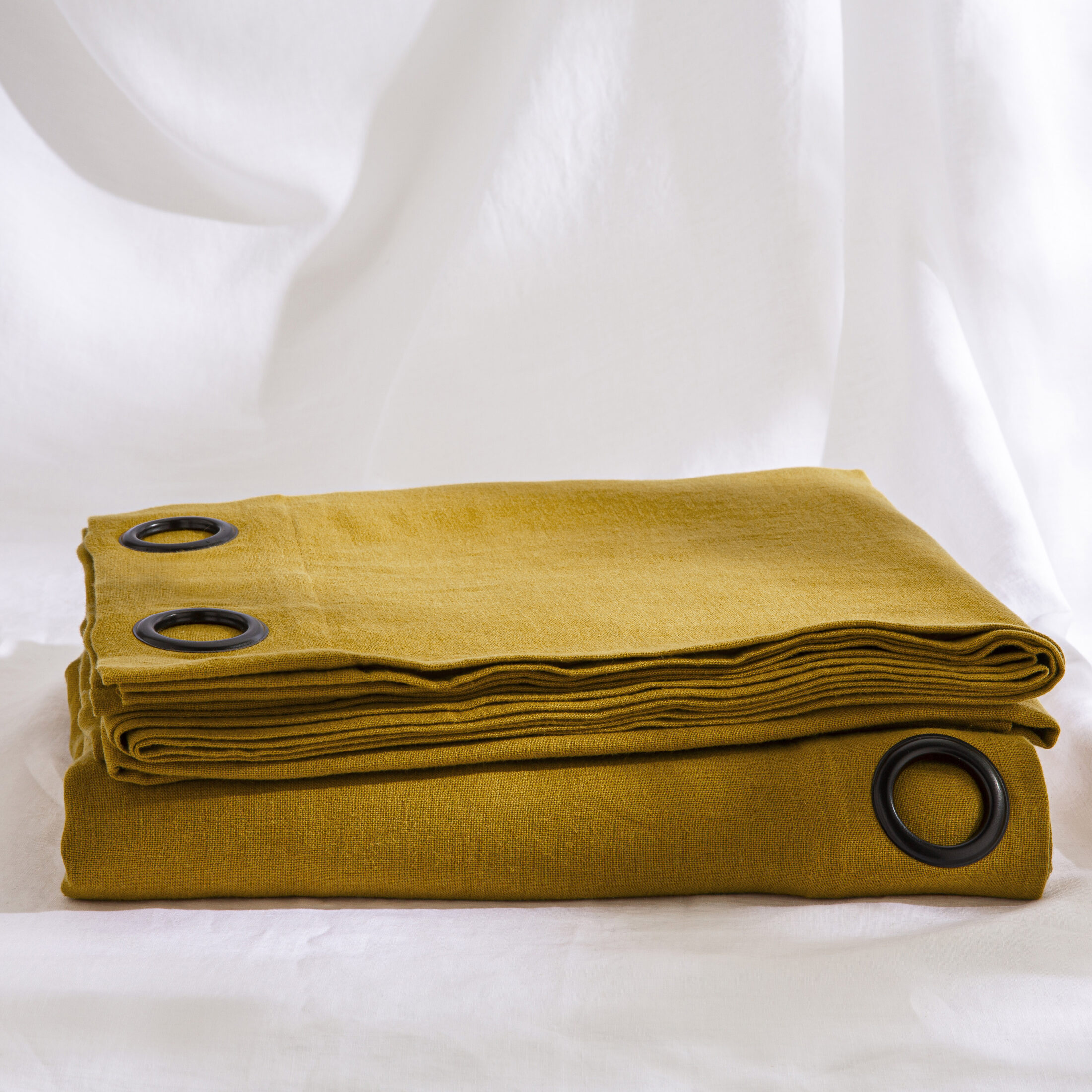 Découvrez notre rideau en lin lavé jaune curry. Le jaune curry est une teinte chaleureuse et vibrante qui peut ajouter une touche d'énergie et de vitalité à votre décoration intérieure.