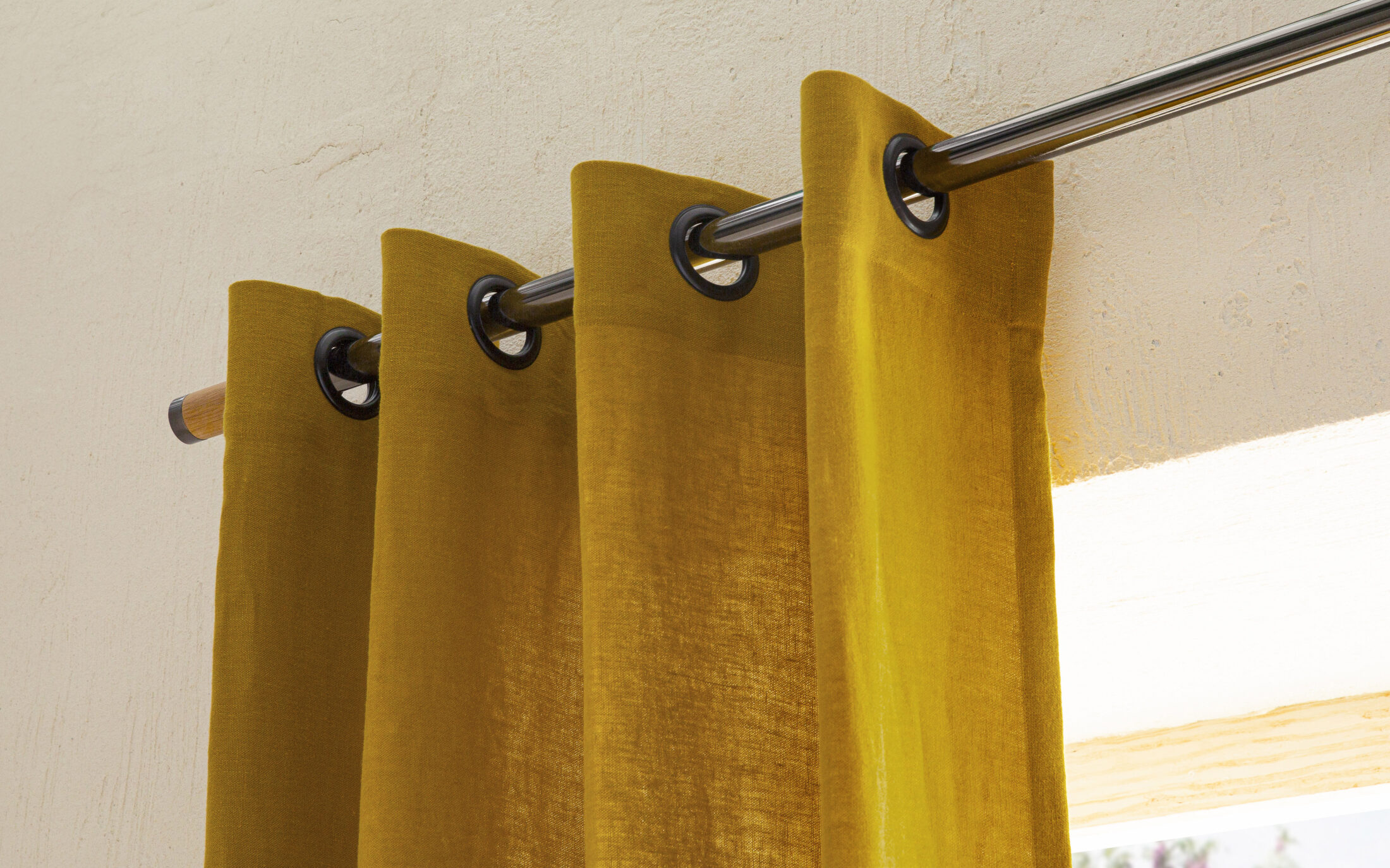 Le rideau présenté possède une finition œillets de coloris noir mat, mais vous pouvez choisir votre coloris d’œillets. Il est vendu sans doublure.