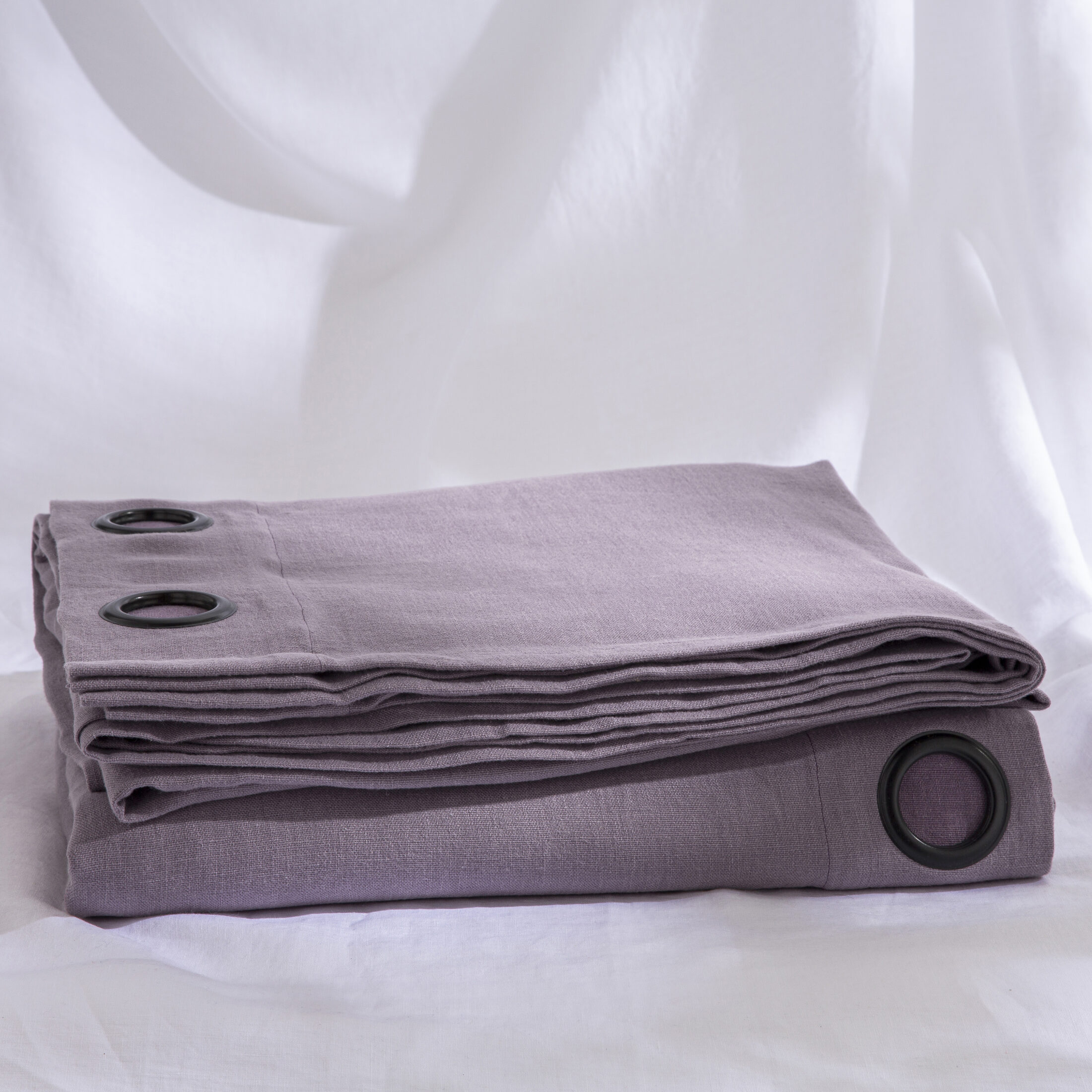 Le rideau présenté possède une finition œillets de coloris noir mat, mais vous pouvez choisir votre coloris d’œillets. Il est vendu sans doublure.