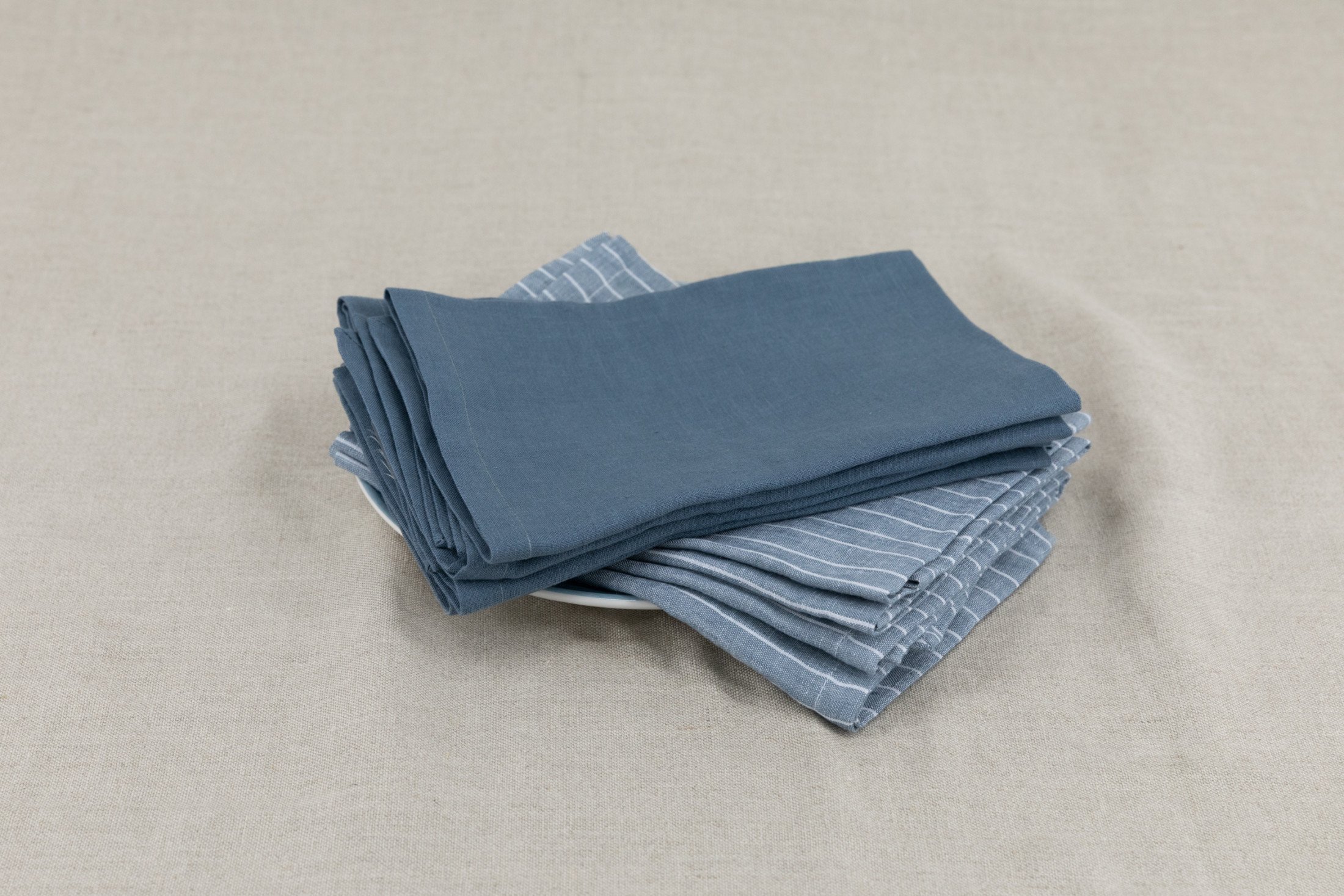 Nos serviettes de table sont constituées de lin lavé, un tissu issu d'une plante que nous cultivons localement, en Normandie. Le lin est ensuite travaillé au sein-même de nos ateliers, à la ferme familiale d'Ambrumesnil. Il est certifié Oeko-Tex, ce qui garantit l'absence totale de substances et produits pouvant être nocifs pour la santé.