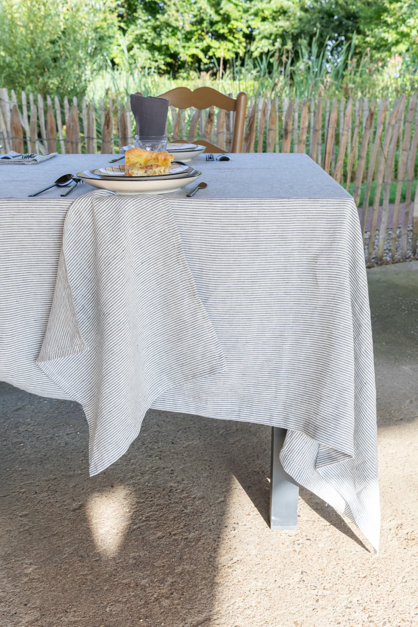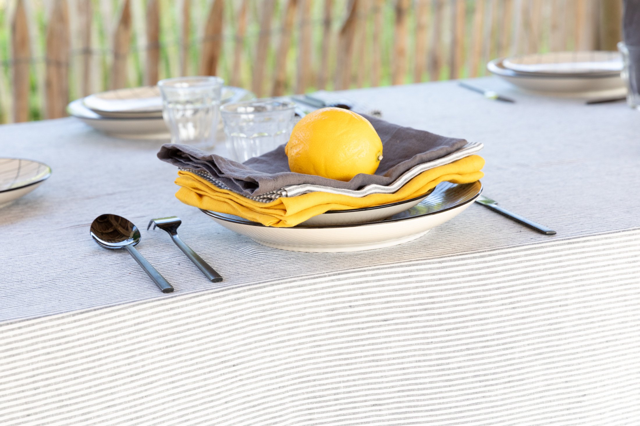 Nos serviettes de table à rayures Gris Silex évoquent la sobriété élégante des maisons de campagne et le calme minéral des galets sur la plage.