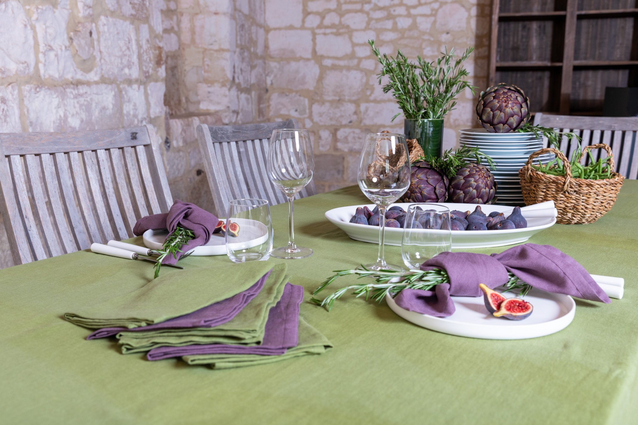 Leur teinte, subtilement nuancée entre le vert tendre et les reflets dorés de l’olive mûrie, invite à la convivialité et à la simplicité des grandes tablées partagées. C’est une couleur à la fois naturelle et profonde, qui raconte la terre, la lumière et le temps qui passe avec élégance.