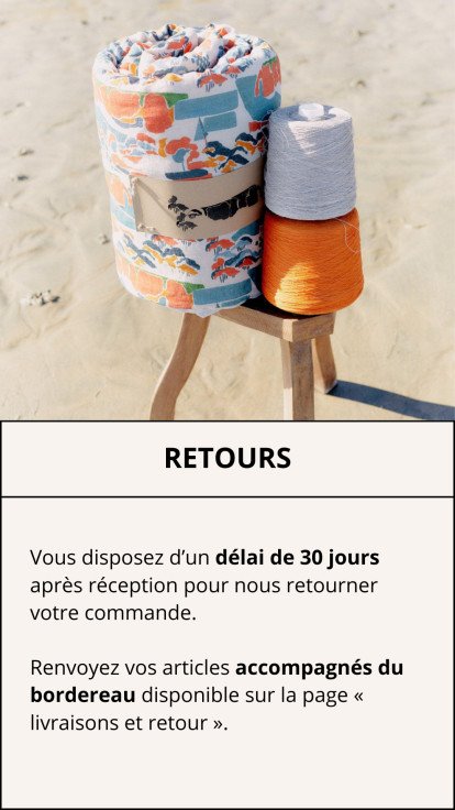 Vous disposez d'un délai légal de 30 jours après réception du colis pour nous informer par écrit via notre formulaire de contact de votre souhait et motif d’échange de l’article accompagné du numéro de votre commande. Les articles sur-mesure ne sont ni repris ni échangés.