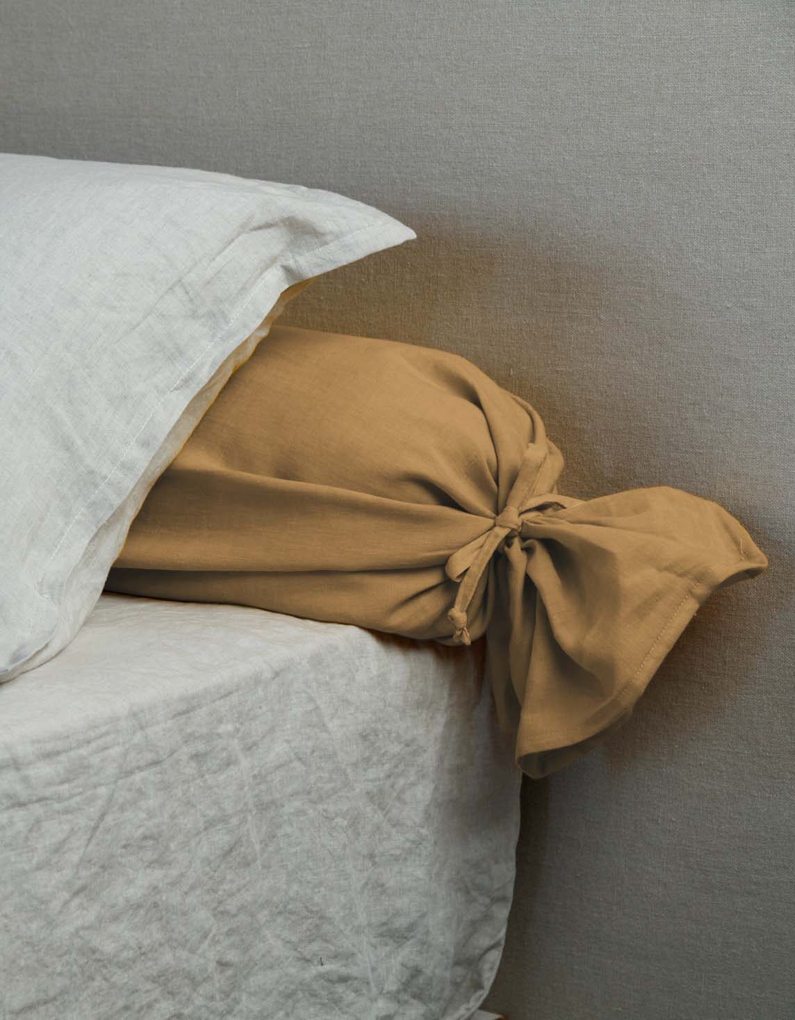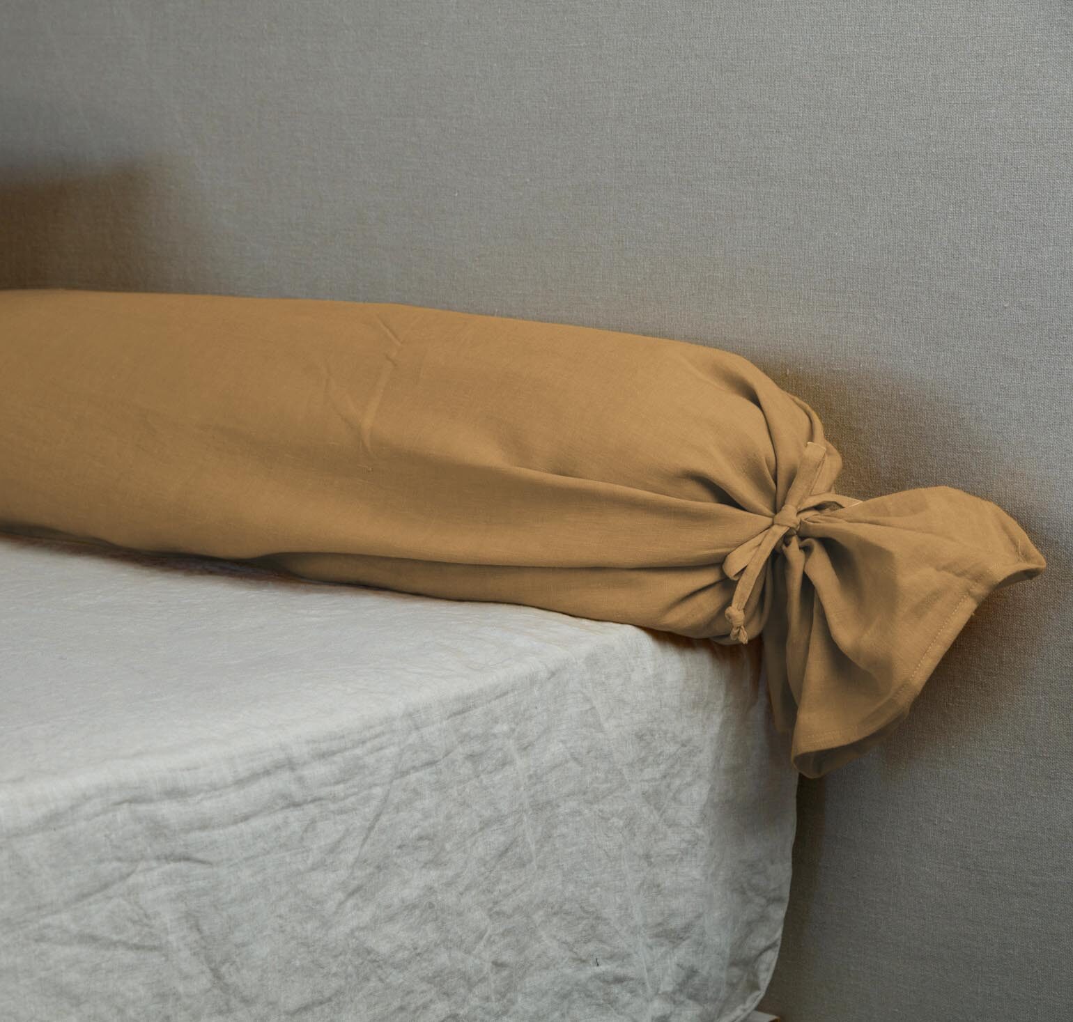 Egayez votre décoration de chambre avec notre taie de traversin en lin lavé coloris miel. Elle accompagnera facilement vos parures de lit et pourra être associée à des teintes comme le gris orage, le kaki ou encore la teinte naturelle du lin.
